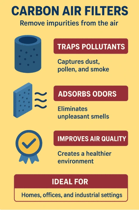 Carbon filters clean air by adsorbing (not absorbing) odors, gases, and VOCs onto millions of microscopic pores.
