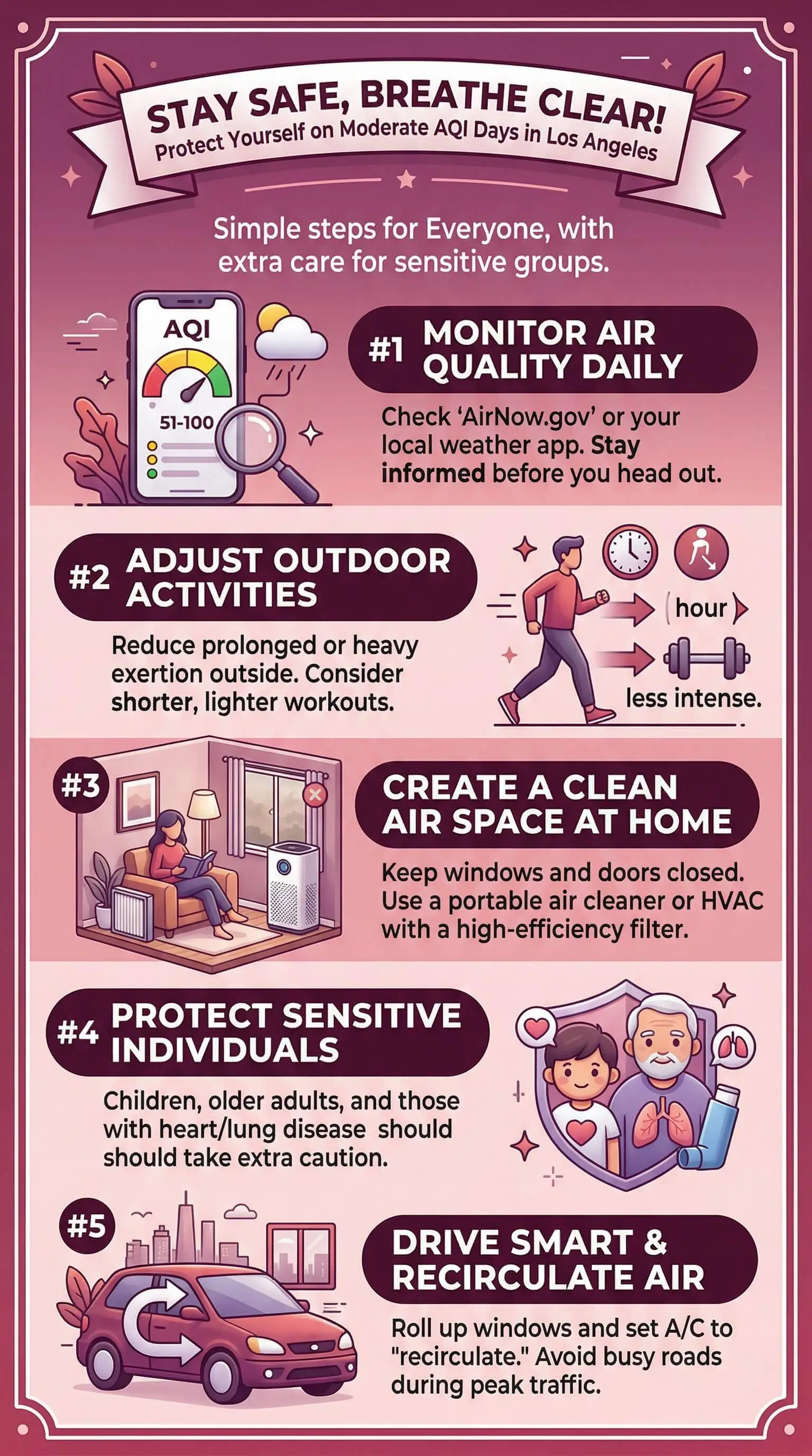 A single moderate AQI day in Los Angeles is manageable with the right precautions. A persistent pattern of moderate readings — or a moderate reading that is trending upward — is a signal worth taking seriously.